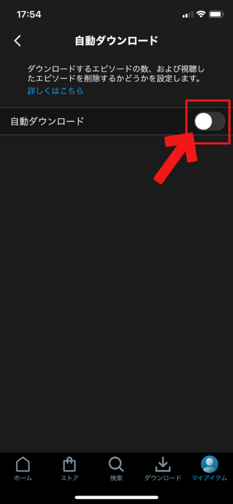 同時に下にある【視聴したエピソードを削除する】のスイッチを入れることで、視聴し終わったエピソードから自動で削除する設定にすることも可能です。