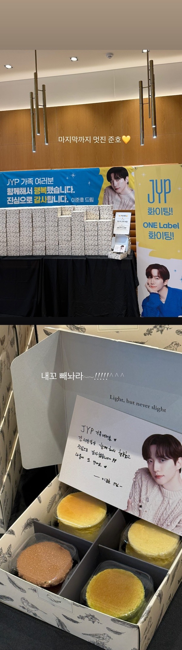 JYPの社員が撮ったとみられる写真には、「JYPファミリーの皆さん、共に過ごせて幸せでした。心より感謝申し上げます。イ・ジュノより」と書かれた横断幕の下に、全社員分のチーズケーキが積まれている様子が写っている。
