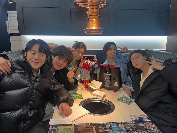 写真には、ドラマで共演中のカン・ユソク、コ・ユンジョン、シン・シア、ハン・イェジとともに打ち上げをする姿が収められている。