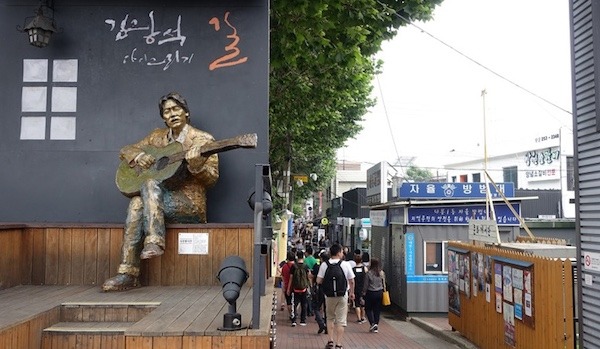 1989年にソロデビューし1996年に31歳の若さで亡くなった、大邱出身の韓国の伝説的なシンガーソングライター「キム・グァンソク」のメモリアルストリート。最寄り駅は地下鉄2号線の慶大病院駅で、徒歩約10分。通りのスピーカーからは彼の名曲が流れており、約350mにわたって彼や彼の歌にまつわる壁画アートが並んでいる。