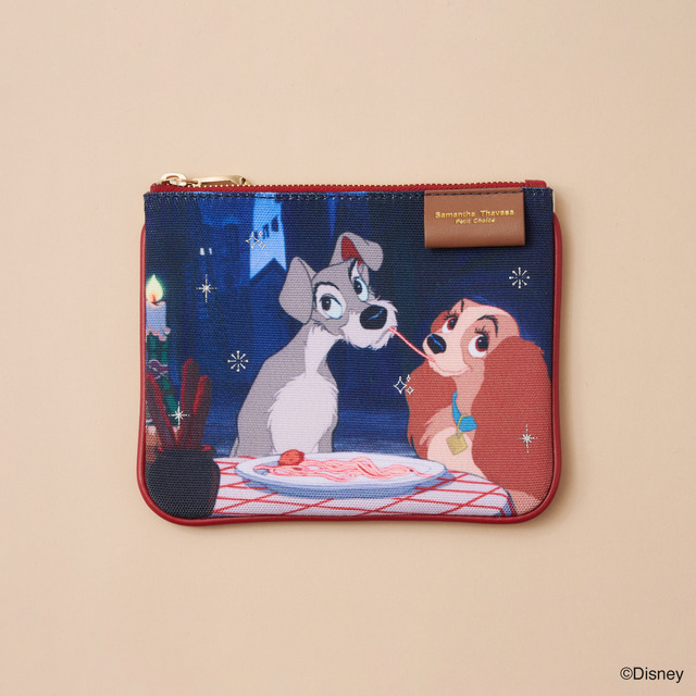 「ポーチ」は、印象的なシーンがフロント全面にデザインされているのが見どころ。フロントにはキャンバス生地、背面には合皮が使用された。キラキラのマーク部分だけグリッターが使用され、デザインのアクセントになっている。背面の格好柄は、2匹がスパゲッティを食べたテーブルクロスの柄のイメージだ。
