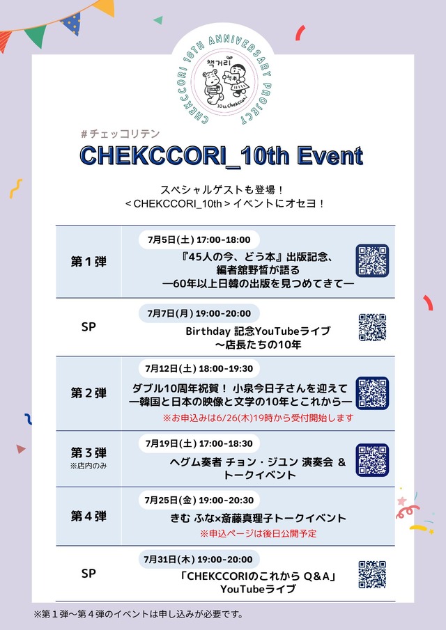 店頭では、チェッコリ店主・金承福(株式会社クオン代表)と俳優・小泉今日子さんによるトークイベント、韓国の伝統楽器・ヘグム奏者のライブ演奏、5月末に出たばかりの新刊『韓国と本に詳しい45人が “今、どうしても薦めたい本”を選んでみました』出版記念会、そして翻訳家きむ ふなさんと斎藤真理子さんによる対談など、いくつもの特別イベントが予定されている(一部配信あり)。