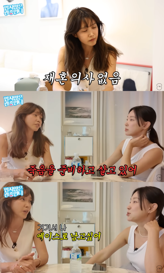 イ・ジヘが「シングルライフに満足してるのか気になる。再婚しないと決めたの?」と問いかけると、チェ・ジョンアンは「あなたみたいには生きられない。そんなに必死に生きたくない。再婚の意思はなく、今は“死に備えて生きている”」と断言し、みんなを驚かせた。