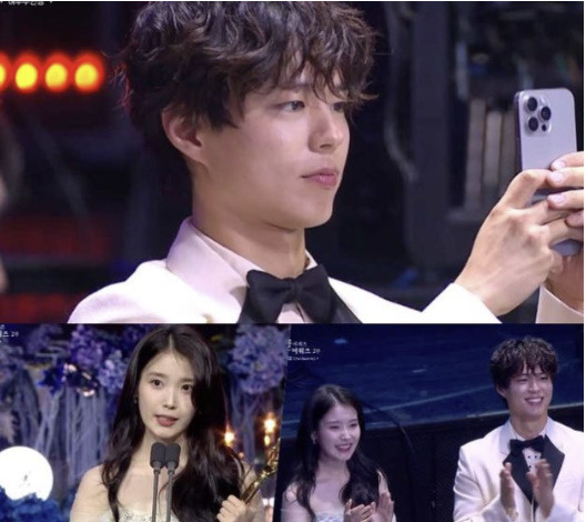 IUが受賞後、彼女に向けてスマートフォンを取り出し、直接撮影する姿がカメラに収められたのだ。