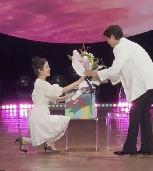 花束を手にしたIUはステージでパク・ボゴムの前に膝をつき、その思わぬ展開に驚いたパク・ボゴムは目を丸くして彼女を見つめた。