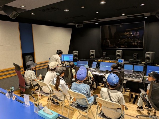 まず訪れたのは、映像の編集や音響作業を行う「ポストプロダクションセンター」。プロが使う編集室では、映画がどのように繋がれていくのかを学び、アフレコルームでは、俳優の声以外の響きが無いように吸音がほどこされた不思議な空間となっており、プロならではのこだわりに驚きの声を上げていた。また音響調整のMAルームやアフレコルームも見学。東宝スタジオはアフレコブースに対して、ディレクションルームが斜めに設置されている。これは音響監督たちが俳優たちの表情も見られるようにという工夫だという。子どもたちは初めて入るアフレコルームに興奮。普段入ることのない特別な空間に興味津々だった。
