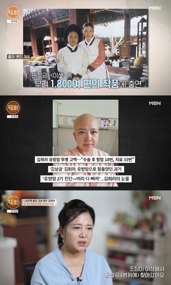 キム・ヒラは「シャワー中にしこりを感じ、病院に行ったら乳がんステージ2末期だった」と語り、「3週間に一度の抗がん治療を受けたが、注射1本で吐き気が止まらず立ち上がることもできなかった」と当時の苦痛を思い返した。