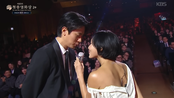 2025年の青龍映画賞祝賀公演として行われたファサの『Good Goodbye』ステージ。10月に発売されたこの曲だが、そのMVに友情出演したのが俳優のパク・ジョンミンだ。客席に座り、口元に手を添えなんだかそわそわしている彼。そこからそっと立ち上がり、MVと同じように赤い靴を持ちながらステージのほうへ向かっていく。