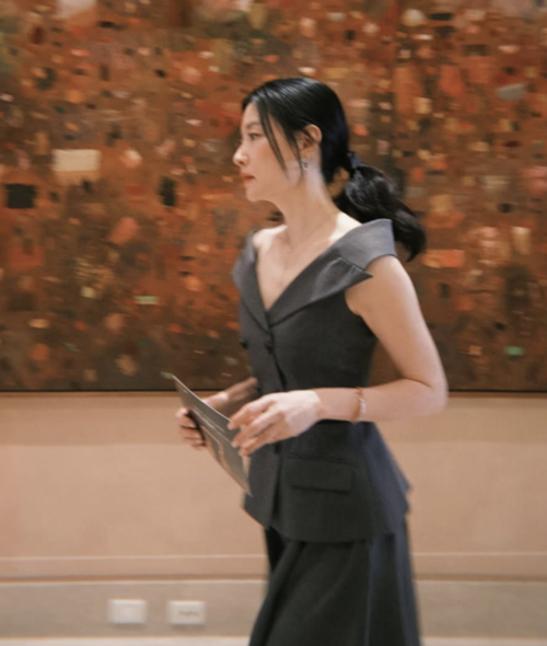 続く写真でイ・ヨンエは、180度異なるギャップのある魅力を披露した。丁寧なメイクアップと洗練されたローポニーテールにスタイルチェンジした彼女は、肩のラインが際立つチャコールグレーのオフショルダーセットアップを完璧に着こなした。