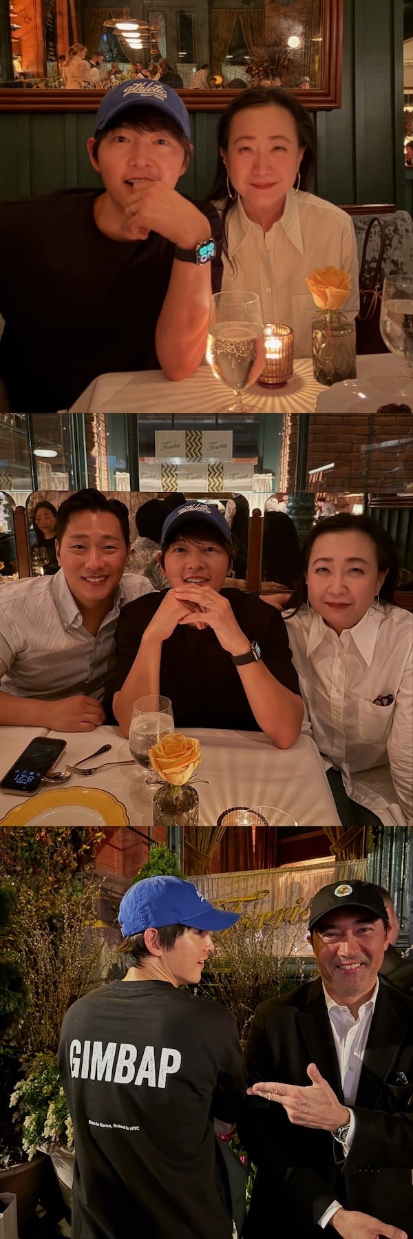 公開された写真には、イ・ミンジン作家と夕食を楽しむソン・ジュンギの姿が収められている。彼はリラックスした装いで自然体の魅力を放っており、シンプルな黒のTシャツの背面には「GIMBAP(キムパプ)」と書かれたロゴがプリントされ、目を引いた。