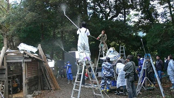 いきなりスタッフの方たちが雨合羽を着込みはじめた。そうなのだ。今日の撮影は雨。散水車で雨を降らせる。3トンの水を積んだ散水車がスタンバイしていた。3トンなんてすごい量だと思っていたら「少ない方ですよ」だそうだ。撮影に入る前に掘っ建て小屋と周辺に水をまいている。これをスタッフの方は「雨濡らし」と呼んでいた。たしかに本番でいきなり雨を降らせても濡れていないところがあったりしたら不自然だろう。さらに照明さんが陽光を遮って曇り空の明るさにする。