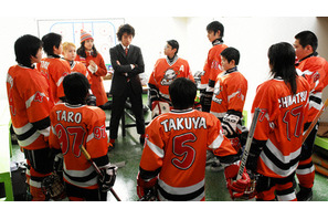 続いて「スマイラーズ」のみんなも一言ずつ挨拶したが、満員の客席を前に一同やや緊張気味。みんな現役のアイスホッケー選手だけあってそれぞれ「アイスホッケーが映画になったことが嬉しい」、「映画を観て少しでもアイスホッケーに興味を持ってもらえたら嬉しい」と語ると会場からは温かい拍手がわき起こった。