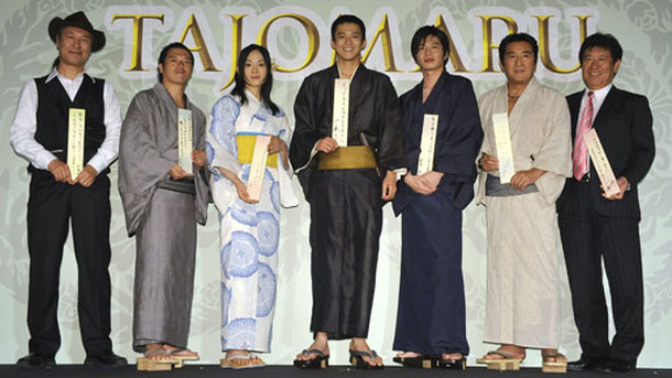 黒澤明の不朽の名作『羅生門』の原作としても知られる芥川龍之介の「藪の中」の登場人物の一人、伝説的な大盗賊・多襄丸を新解釈で描ききる『TAJOMARU』。9月に公開を控えた本作がついに完成を迎え、7月5日(日)、監督を務めた中野裕之、主演の小栗旬に柴本幸、田中圭、やべきょうすけ、松方弘樹、山本又一朗プロデューサーと、主だったメンバーを揃えての完成報告会見が行われた。