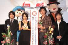 全世界で790万本を超える出荷数を記録している人気ゲームソフト「レイトン教授」シリーズが待望の映画化! 12月1日(火)に『レイトン教授と永遠の歌姫』の完成披露試写会が早稲田大学大隈講堂にて開催された。声優を務める大泉洋、堀北真希、渡部篤郎、相武紗季、水樹奈々、そして橋本昌和監督に「レイトン」の生みの親とも言うべき日野晃博が登場した。さらに、ゲーム最新版の新たな声優として市村正親の名が発表され、本人も登場。「レイトン」ファンで埋めつくされた会場は大きな盛り上がりを見せた。