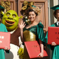 山寺さんとひとりさんは、オリジナル学帽に緑のマントというスタイルで卒業式に臨み、こちらも少々緊張気味。山寺さんは10年間演じたロバのドンキーに「長い声優人生の中でも、最も印象に残っているキャラクターのひとつ。本当に誇りに思う」と愛着たっぷりで、「こんなド派手な卒業式をしていただいたが、いつか再入学したいなぁ」と名残惜しそうな様子。一方、ひとりさんは最初で最後の出演とあって「入学式と同時に卒業式を迎えた。まるでレストランに入った瞬間、『ラストオーダーです』と言われたみたい」と手にした卒業証書にも複雑な表情だった。