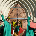 藤原さんは、ゴールドをベースに“シュレックカラー”の緑を配したドレスで登場。「フィオナの雰囲気が出せればと思って。お気に入りはこの帽子です」と語る衣裳は、この日のために用意された特注品だ。大聖堂の厳粛な雰囲気に少し緊張した面持ちだったが「素敵な作品に参加できたという喜びで、いまは晴れ晴れしい気持ちですね。さみしさはありますけど、私の心の中にはシュレックたちがずっと生き続けると思う。10年間幸せな日々でした」と晴れやかな笑顔を見せた。