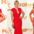 今年、最も目立ったドレスのカラーは何と言っても「赤」。着用数が飛びぬけて多かったわけではなく、色の傾向で言えば青やヌードカラー、そして黒も負けてはいなかったのですが、「ミルドレット・ピアース 幸せの代償」でミニシリーズ/TVムービー部門の主演女優賞を受賞したケイト・ウィンスレット(上写真/中央)のエリー・サーブと「glee」のレイチェルことリー・ミッシェル(上写真/左)のマルケーザに視線が集まっていました。さらに、「Modern Family」でコメディ・シリーズ部門助演女優賞候補だったソフィア・ヴェルガラ(上写真/右)のヴェラ・ウォンや、「ヴァンパイア・ダイアリーズ」でティーンに人気のニーナ・ドブレフが着用するダナ・キャランも赤。ホットな女優たちをより美しく見せる役割を担っていたのが赤、といったところでしょうか。