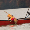 そして3枚目は、番組のロケで湖でのカヌーに挑戦しようとするまさおの姿。設定では、松本君の乗るカヌーとまさおの乗るカヌーが競争をしている最中に、まさおが湖に飛び込み、松本のカヌーをひっくり返してしまうというシーンなのだが、実はこの日の気温は氷点下、みぞれ交じりの雪も降る中での撮影だったとか。こんな超極寒の中で湖に飛び込むのには、人間はもちろん勇気が要りそうなものだが、やはりまさおは水が大好きなのか? 監督の「よーいスタート!」という掛け声の前に、まさお自ら湖に飛び込もうとソワソワ。それを見て、スタッフも大急ぎでセッティング、香取さんと仲良く氷点下の湖を泳いでいたようだ。