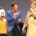 人気ユニット「Perfume」が2月24日(日)、都内で開催されたシリーズ33作目『映画ドラえもん のび太のひみつ道具博物館(ミュージアム)』の完成披露試写会にサプライズ登場し、本作の主題歌「未来のミュージアム」(2月27日発売)をライブで初披露した。映画は謎の男“怪盗DX”にトレードマークの鈴を盗まれてしまったドラえもんが、のび太たちと一緒に未来にある「ひみつ道具博物館」で手がかりを探すというお話。ミステリー仕立ての本作にちなんで、CDのジャケット写真と同じ“探偵ルック”に身を包んだ「Perfume」の3人が登場すると、会場の子どもたちはもちろん、お父さん、お母さんも大喜びだ。メンバーを代表し西脇綾香(あ~ちゃん)は、「3人ともドラえもんが大好きなので、主題歌を歌えるなんて本当に信じられない。夢と希望にあふれた楽曲になった」とアピール。毎回、ユニークなダンスが話題の「Perfume」だが、今回はタケコプター、どこでもドア、四次元ポケットといった“ひみつ道具”が振付に盛り込まれており、その可愛らしい動きが会場でも大受けだった。舞台挨拶には、怪盗DXを追い続ける22世紀の刑事・マスタード警部を演じる松平健、本作の応援団長であるタレントの松岡修造、応援団の鈴木福くん&夢ちゃん兄妹が登壇した。松平さんは「楽しく演じさせていただいた。やっぱり子どもたちに喜んでもらえる作品に参加できるのは嬉しいですね」とニッコリ。マスタード警部はダジャレ好きという設定で「今日は来てくださって、ありがとうございマスタード!!」と挨拶し笑いを誘った。また、福くんは「映画を観て、頑張ることと仲間が大切だなと思いました」とアピールしていた。もちろん、水田わさび(ドラえもん)、大原めぐみ(のび太)、かかずゆみ(しずか)、木村昴(ジャイアン)、関智一(スネ夫)、千秋(ドラミ)らレギュラー声優陣も勢ぞろい。『映画ドラえもん のび太の新魔界大冒険~7人の魔法使い~』、『映画ドラえもん 新・のび太と鉄人兵団~はばたけ 天使たち~』に続き、メガホンをとった寺本幸代監督は「とにかく楽しい作品を目指した。誰にでもいいところがあると、みなさんに感じてほしい」とメッセージを送った。『映画ドラえもん のび太のひみつ道具博物館(ミュージアム)』は3月9日(土)より全国東宝系にて公開。