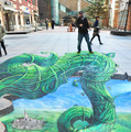 映画『ジャックと天空の巨人』の公開に合わせて、ギネスにも認定されている3Dトリックアートの第一人者であるジョー・ヒルが来日し、日テレのゼロスタ広場に巨大な豆の木の3Dトリックアートを完成させた。『ユージュアル・サスペクツ』、『X-MEN』シリーズのブライアン・シンガーが「ジャックと豆の木」の童話を基に、巨人たちが救う展開の扉を開けてしまった青年・ジャックの大冒険を描いた本作。この作品の世界観に沿ってヒルは、広場の地下にある世界から1万メートルもの巨大な豆の木が伸びてきて、地面を突き破ったという絵を描いた。パッと見では単なる地面に描かれた巨大な絵にしか見えないが、不思議なことにヒルが示した場所から写真を撮影してみると、本当に地面の底から豆の蔓が飛び出してきているように見える。道行く人々は蔓によじ登ったり落ちそうになったり、はたまた割れ目から下界をのぞき込んだりと思い思いのポーズを取って記念撮影を行なっていた。当初、映画を配給するワーナー・ブラザースからこの話を持ちかけられたとき「3Dトリックアートとして、地面からせり出してくる豆の木というのは完璧な題材だと思った」と語るヒル。リアルとファンタジーをつなぐ架け橋でもあり、ワクワクしました」と明かす。「これまで9年にわたって研さんを積んできた」と言うが「参加型のアートである点がトリックアートの魅力です。みんなが『中に入りたい』と思うような作品を作りたい。どこに人が立つのかをイメージして作ることが最も大切ですが、その一方で必ずこっちが思いもよらない参加の仕方をする観客もいます。そうしたインタラクティブ(相互的)なやり取りが楽しいんです」と語る。ちなみに9年前と言えば、まだまだ『アバタ―』以前であり、まだまだ映画界では3Dが話題にすら上っていない頃である。9年を経て本作を含め映画の世界でこれだけ3Dが当たり前になってきた現状を3Dアーティストとしてはどのように見ているのだろうか? そう尋ねると「僕自身、3Dの映画は大好きなんです」と人懐っこい笑顔を浮かべ、さらに続ける。「見る人を引き込んで“参加させる”という点ではどちららも同じアートだけど、技術的には実は正反対なんです。レイヤー(層)を重ねて3Dとして厚みを表現するのが映画の3Dだけど、僕の方は道路という実際に3Dで存在する場所に2Dのイメージを描いて3Dに見せかけるというもの。そういった違いも含めて面白いなと思ってます」。3か月にわたってニューヨークのタイムズスクエアに展示されたものなど世界各地で大小様々なアートを展開し、ギネスにも認定されたヒルだが、今後、描いてみたい作品については「カフェやそこに集うミュージシャンとかいくつもの要素が描かれた空間を描きたいね。映画が大好きだから、そこから得たモチーフで作品を描けたら面白いなと思います。あとは巨大な隕石も描いてみたいな。地面を削りながら突き刺さる隕石。いつかやってみたいね」とイタズラっぽい笑みを浮かべて明かしてくれた。『ジャックと天空の巨人』は3月22日(金)より丸の内ルーブルほかにて公開。3Dトリックアートは17日(日)まで11:00~19:00のスケジュールで日本テレビのゼロスタ広場(東京・汐留)にて展示予定。