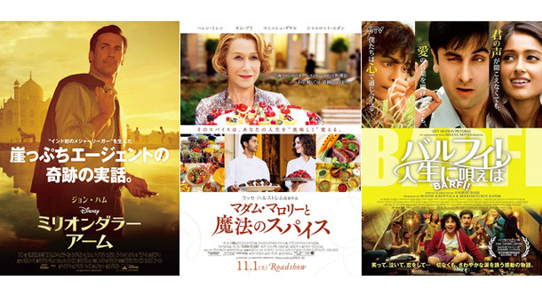 2013年のロングランヒットも記憶に新しい、笑って泣けるヒューマン・コメディ『きっと、うまくいく』以降、日本でも注目度上昇中のインド映画。この夏も、『バルフィ!人生に唄えば』など、煌びやかに歌って踊るだけではない、これまでのボリウッド映画とはひと味違う良作が、映画ファンたちの心を静かにアツくとらえている。その流れはハリウッドも同様で、この秋、10月には“インド初のメジャーリーガー”を生んだスポーツ・エージェントの実話を描く『ミリオンダラー・アーム』、11月には老舗フレンチ・レストランと新興インド料理店が巻き起こす攻防戦を軸に、料理を通した心の交流を描く『マダム・マロリーと魔法のスパイス』が相次いで公開される。時に悩み、傷つき、それでも前向きに生きる等身大の人間同士が織りなす、ちょっぴりスパイスの利いたドラマに心震える、今年の“インド”映画に注目した。現在公開中の『バルフィ!人生に歌えば』は、聴覚障がいのあるバルフィと、2人の美女によるハートフル・ストーリー。歌や踊りやもちろん、台詞自体も少なく、バルフィは言葉を話す代わりに、身ぶりや手ぶり、そして豊かな表情で感情を表現し、愛を伝えていく。まるでサイレントの喜劇王チャールズ・チャップリンを彷彿とさせる、温かみある作品となっている。また、6月からロングランとなっているのが、『マダム・イン・ニューヨーク』。親戚の結婚式のためインドからニューヨークへやってきた、料理上手で良妻賢母のシャシが、苦手な英語を克服しようと外国人のための英会話学校へ通ううち、誰のためでもない、自分自身の人生を輝かせていく物語だ。『めぐり逢わせのお弁当』は、夫と上手くいっていないイラの手づくりお弁当が、600万分の1の確率で妻を亡くしたばかりのサージャンに誤配達されることから始まる、大人のラブストーリー。初お披露目されたカンヌ国際映画祭では批評家週間観客賞を受賞、その後も各国の映画祭を席巻し、ヨーロッパで大ヒット。全米でも2014年に公開された外国映画の中で最も見られた作品となった。そして、10月4日(土)に公開される『ミリオンダラー・アーム』は、ディズニーが贈る、インド初のメジャーリーガーを生んだ崖っぷちエージェントの実話の映画化。業界の変化に取り残され、契約選手は離れて行く…まさにキャリアの危機に立たされたスポーツ・エージェントのJB・バーンスタインは、起死回生をかけた最後の賭けに出る。それは、野球未開の地インドで、野球によく似たメジャーな競技=クリケット選手の中から隠れた逸材を発掘し、メジャーリーグでデビューさせるという奇策だった。JBは、地元テレビ局と組んで「ミリオンダラー・アーム」という番組を企画し、インド全土でコンペティション形式のトライアウトを実施。やがて、2人の18歳の青年が選出され、JBはアメリカへと連れていくが、文化の違いや野球未経験のハンデなどから、問題が次々と発生してしまう。JBを演じるのは「MAD MEN マッドメン」のジョン・ハム。インドで発掘した選手役には、『ライフ・オブ・パイ/トラと過ごした227日』のスラージ・シャルマと『スラムドッグ$ミリオネア』のマドゥル・ミッタルが扮し、勇気と感動のサクセス・ストーリーを紡いでいく。さらに、製作スティーヴン・スピルバーグ&オプラ・ウィンフリー、監督は『ショコラ』のラッセ・ハルストレム、主演にヘレン・ミレンと、まさにドリーム・チームが結集したのが、11月1日(土)より公開の『マダム・マロリーと魔法のスパイス』。老舗のフレンチ・レストランと新興インド料理店という2つの“料理”と文化が織りなす、可笑しくも、心温まるヒューマン・エンターテイメントだ。マダム・マロリーが経営する南仏のミシュラン1つ星フレンチ・レストランの真向いに、ある日、賑やかな音楽とともにスパイスたっぷりの料理を提供するインド・レストランがオープン。100フィート(約30m)の道を隔てた2つの店では、“異文化の衝突”が日常茶飯事。しかし、この“戦い”が、やがて頑ななマダム・マロリーの心を解かし、両レストランに関わる人々の心にも変化をもたらしていく…。“食”を始めとする独特の文化が常に人々とともにあるインドのエッセンスを、ハリウッドがどのように取り入れているのか、これから公開されるこの2作からも目が離せなくなりそうだ。