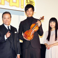 映画『マエストロ』の完成披露試写会が12月2日(火)に開催され、主演の松坂桃李に西田敏行、初めて女優業に挑戦したシンガーのmiwa、小林聖太郎監督が舞台挨拶に登壇。松坂さんは、“11億円”もの価値を持つヴァイオリンの王様「ストラディヴァリウス」を生で演奏した。さそうあきらの漫画を原作に指揮者の佐渡裕(指揮指導)、ピアニストの辻井伸行(エンディングテーマ)など第一線で活躍する音楽関係者も参加した本作。人生挫折中のヴァイオリニストが、不況で解散が伝えられた名門オケの復活に心躍らせるが、その仕掛け人である指揮者・天道は破天荒な謎のひげ男で、メンバーも“負け組”ばかり。だが天道の導く音の深みが楽団員の心を動かし始め…。松坂さんは「日本の音楽映画に新しい風を吹かせにやってきました」と完成した作品への自信を語り、西田さんも「血の出るような努力、血の出るような指揮ぶりで頑張りました!」と胸を張る。実際、松坂さんはこれまで全くヴァイオリンに親しんだ経験はなかったが、撮影開始の1年前もから練習を開始! 「最初は難しささえ全く分かっておらず、(ジブリ映画の)『耳をすませば』の天沢聖司みたいでカッコいいなとか(ヴァイオリンの演奏の難しさを)すごいことと捉えることさえできない自分がいたんですが(笑)、練習を始めてだんだん口数が減っていく地獄の日々でした」とふり返った。miwaさんは、年末の「紅白歌合戦」への2年連続参加が先日発表され、会場は祝福の拍手に包まれた。今回、演技初挑戦で戸惑うこともあったよう。さらに、フルートの演奏をせねばならず「4か月練習した」と明かすなど、初挑戦尽くしの作品となった。西田さんは初めてとなる指揮者役について「一度は役としてやってみたかった」と語り「指揮者が汗だくで陶酔する姿を見て、あのとき何を見て、何を感じているのか? 俳優として知りたかった」と強く役柄として惹かれたと語った。そして、この日の最高値の“ゲスト”として11億円のストラディヴァリウスと2,000万円の弓が警備員に警護されながら恭しく壇上へと運び込まれる。劇中で見せた腕前を観客の前で披露することとなった松坂さんは、つい先日別の映画の舞台挨拶で瓦の10枚割りを行なったことを引き合いに「最近、ムチャぶりが多い…(苦笑)」とボヤきつつ、手の汗を拭ってストラディヴァリウスを手に取り、緊張した面持ちでその音色を奏でた。演奏を終えるとドッと疲れたような顔を見せつつ「ヴァイオリンから出る振動が身体に伝わってきました。弓も重さがあって、(ヴァイオリンに)乗せただけで自然と吸い寄せられるような感覚」と感想を口にした。この日は、プロのヴァイオリニストの演奏による、一般的なヴァイオリンとストラディヴァリウスの音色の聴き比べも行われたが、観客の耳にもその差は歴然! 深みのある音色に松坂さん、西田さん、miwaさんも恍惚の表情で耳を傾けていた。『マエストロ』は2015年1月31日(土)より全国にて公開。