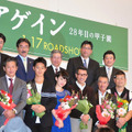 甲子園を目指す中年男たちのドラマを描いた映画『アゲイン 28年目の甲子園』の特別試写会が12月11日(木)に開催され、主演の中井貴一をはじめ、波瑠、工藤阿須加、柳葉敏郎、さらプロ野球界のOBたちが顔を揃えた。重松清の小説を原作に、元高校球児たちを対象にした「マスターズ甲子園」を題材に描く本作。28年前にある事件で県大会決勝を辞退した主人公をはじめ、中年オヤジたちが再び甲子園を目指して奮闘する姿を描き出す。中井さんは、野球未経験ながらも猛特訓を受けて本作に臨んだが「練習は8月の39度の暑さで熱中症が心配される中、50過ぎの未経験者が初めてノックを受けてた(苦笑)。撮影は12月で、野球はやっちゃダメですよって時期。未経験者がスパイク履いてスライディングさせられてた。映画業界ってムチャクチャです!」と嘆く。工藤さんは、かつて西武、ソフトバンク、巨人などで活躍した大投手で、来シーズンよりソフトバンクの監督に就任した工藤公康を父に持つが、本人は野球未経験。野球選手を演じたTVドラマ「ルーズヴェルトゲーム」よりもこちらの撮影の方が先だったとのことで「お話をいただいてから、毎日走って、500回から1,000回素振りをしました」とふり返る。柳葉さんは元エースという役柄だったが「背番号1を着けて甲子園のマウンドに立たせていただきました!」とニンマリ。「内緒でマウンドの土を持って帰りました」と嬉しそうに明かした。この日は、映画にも出演している元プロ野球選手で、巨人で中継ぎ投手として活躍した角盈男、元広島で盗塁王などを獲得した高橋慶彦、そして、中井さんらの練習を指導し、野球監修を務めた元巨人の大石慈昭も来場した。高橋さんは「甲子園は小さい頃からの夢で、映画を観て少年時代を思い出しました」とふり返り、角さんは中井さんらが劇中で見せている野球のパートについても称賛。特に柳葉さんの投球について「巨人vs阪神のOB戦で投げたら、真っ直ぐが86キロで、ギバちゃんが投げるのを見て『負けたかな』と思いました。みなさん、引退して30年後の野球選手の姿として完璧です!」と称えた。この日はさらに、映画には出演していないが、かつてのプロ野球界を彩った名選手たちが続々と祝福に駆け付けた。元ロッテの名投手・八木沢壮六、兄弟ピッチャーとして西武の黄金時代を支えた松沼博久、松沼雅之、元広島、ヤクルトの強打者・小早川毅彦、巨人および横浜ベイスターズで活躍した駒田徳広らが登壇陣に花束を贈呈。これには中井さんらも感激した面持ちで、会場に足を運んだ野球ファンの観客からも拍手が沸き起こった。中井さんは、野球経験者の共演陣たちが甲子園に足を踏み入れた瞬間に「勝ち上がって行ったわけでもなく、撮影で行かせてもらってるのに号泣してました」と明かし、改めて甲子園という聖地の重みを受け止めつつ「おじさんたちに永遠に夢を追い続けてほしい!」とメッセージ。柳葉さんも「中年の男たちが何かに向かっていく純粋さ。それを支える家族――みなさんとリンクして観ていただければ」と呼びかけた。『アゲイン 28年目の甲子園』は2015年1月17日(土)より全国にて公開。