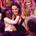 子ども向け専門のケーブルTVチャンネル「ニコロデオン」主催の「キッズ・チョイス・アワード」が28日(現地時間)発表になり、アンジェリーナ・ジョリーがお気に入り悪役賞を受賞、授賞式に一緒に出席した娘2人と喜びを分かち合った。ロサンゼルスのザ・フォーラムで行なわれた授賞式に、アンジェリーナは10歳の娘・ザハラちゃんと8歳の娘・シャイロちゃんを伴って出席。昨年の主演作『マレフィセント』で、お気に入り悪役賞を受賞した。アンジェリーナの名前が呼ばれると、両脇に座っていた娘たちは歓声を上げてママに抱きつき、アンジェリーナもうれしさいっぱいの表情でハグをした。トロフィーを受け取ったアンジェリーナは「変わっているのはいいことです。だから、合わせようとなんてしないで」とスピーチ。そして「もし誰かに『あなたは変わってる』と言われたら、笑顔で顔を上げて、誇りをもってください」と疎外感を覚えている子どもたちにメッセージを送った。そして最後は「あなたたちの悪役として言わせてもらうとすると…ちょっと問題を起こしてみなさい。あなたのためになるわよ」といたずらっぽく締めくくった。