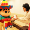 シリーズ23作目となる映画クレヨンしんちゃんの最新作『オラの引越し物語~サボテン大襲撃~』。映画史上初めて、“春日部”から引越し、舞台を“メキシコ”に移すことになった野原家。先日、しんちゃんが引越しの挨拶をしにシネマカフェ編集部にやってきた。父・ひろしは、メキシコの町に生息するサボテンの実を集めるため、転勤を命じられる。一家そろって引越しを決意したみさえやしんのすけたち。春日部のみんなと涙のお別れ。そしてたどり着いた町の名前は「マダクエルヨバカ」。個性いっぱいのお隣さんたちに囲まれて楽しい毎日がスタートするはずが…。レギュラー声優陣に加え、「SKE48」の指原莉乃、「日本エレキテル連合」朱美ちゃん&細貝さんがゲスト声優を務めた本作。主題歌は「夏色」や「栄光の架橋」などヒット曲を多数世に送り出している国民的アーティスト「ゆず」が担当する。エスカレーターに乗って登場したのは、本作の舞台“メキシコ”の衣装に身を包んだしんちゃん。マラカスを持ってウキウキとドアを開けたしんちゃんも、待ち構えていた編集部のフラッシュの嵐にビックリした面持ちだったが、女性陣に囲まれ上機嫌のしんちゃんはノリノリでポージング!ほかにもPCで自身のニュースを見たり、編集部がちゃんと仕事しているかをチェック。最後に引っ越しの挨拶として、映画公開記念で作られたメキシカンタコス味の“チョコビ”をプレゼントして大満足の様子で編集部を後にした。『オラの引越し物語~サボテン大襲撃~』は4月18日(土)より全国東宝系にて公開。