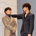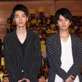 「いままで壁ドンなんて、やったことない」と大照れの岡田さん。それでも瀬々敬久監督よる熱心な演技指導によって、岡田さんと染谷さんの距離は徐々に縮まり、「愛してるよ」(岡田さん)、「僕も…」(染谷さん)とBLばりのセリフも飛び出した。ついに、岡田さんが染谷さんを追いつめ、壁ドンすると、見事に壁がドカンと崩れ落ち、女性ファンからは黄色い歓声! 「初めての壁ドンの相手が染谷で良かった」(岡田さん)、「一生の思い出になりました」(染谷さん)とお互い、清々しい表情を浮かべていた。