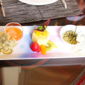 続く二品目は、「スティッチ・デザートメドレー(7月8日~8月31日)」(¥1,650)を。これは、東京ディズニーランドにオープンした新アトラクション「スティッチ・エンカウンター」をイメージした期間限定(7月8日~8月31日)のスペシャルデザートのメドレーで、ココナッツとチョコレートのタルト、アサイーとブルーベリーのスムージー、パイナップルのシュークリーム、フローズンヨーグルトアイスの4種で構成。お皿には英字で「スティッチ・エンカウンター」がデコレーションされていて、お味も見た目も、パークとの連動感も満点だ。