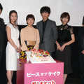 ジョージ朝倉の大人気コミックを映画化した『ピース オブ ケイク』の初日舞台挨拶が9月5日(土)、東京・新宿バルト9で行われ、初共演を果たした多部未華子と綾野剛が登壇した。仕事も恋愛も自分から行動することなく流されるまま生きてきた、24歳の志乃(多部さん)は心機一転、引っ越したアパートの隣人で新しいバイト先の店長・京志郎(綾野さん)に恋心を抱くが、京志郎には同棲中の彼女がいて…。司会者から演技について質問された多部さんは、「うーん、どうでしたかねー…」と語ると、その後は無言に。すると、隣に立つ綾野さんが「そういえば、共感できる点があるって言っていなかったっけ?」「どんなところに共感したの?」とスマートに“助け舟”を出し、「まだ、おねむの時間かな?」と若干寝ぼけた(?)多部さんをフォローしていた。映画のテーマにちなみ、「人を好きになるとは、どんなこと?」と聞かれると、多部さんは「タイミングですね。タイミングがすべてだと思います」と今度は即答。一方、綾野さんは「性(さが)ですかね…」としみじみ答えていた。舞台挨拶には多部さん、綾野さんに加えて、木村文乃、光宗薫、柄本佑、峯田和伸、田口トモロヲ監督が出席。この日はタイトルにあわせて、思い思いにデコレーションをした“ケーキの1ピース”を、寄せ集めてお祝いケーキを完成させた。『ピース オブ ケイク』は新宿バルト9ほか全国にて公開中。