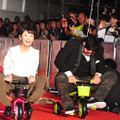 映画『メイズ・ランナー2:砂漠の迷宮』のジャパン・プレミアが10月14日(水)に開催され、映画にちなんで柔道家の篠原信一、タレントのおのののか、小島よしおがレッドカーペットで苛烈なサバイバルゲームを繰り広げた。世界的ヒットとなったサバイバルアクションの第2弾。恐るべき迷宮を脱出したかに見えた主人公たちを次なる試練が襲う。篠原さんらはレッドカーペットイベントでありながら、上半身は正装(※普段、裸の小島さんはタンクトップ)、ズボンおよびスカートはミリタリーという一風変わったドレスコードに従って登場! これはレッドカーペットをただ歩くのではなく、サバイバルレッドカーペットとしてゲームを行い、しかも優勝者以外はこの日のギャラはなしという過酷な条件も。事前に知らされていなかった篠原さんらは不満タラタラながらも気を取り直してゲームスタート!地面に立てたバットに頭をつけてグルグル回ってから、麻袋に入ってピョンピョン飛び跳ね、手を使わずにパンを食べて、最後は三輪車でゴールという内容だったが、いきなり平衡感覚を失った篠原さんが小島さんのズボンを脱がすなど、思わぬ展開に…。おのさんが抜け出し見事1着でゴールし、2着にはズボンを失いつつも海パンで前に進んだ小島さん。篠原さんは巨体に三輪車がかみ合わず、前に進めずに最下位となった。続く舞台挨拶と報道陣向けの質疑ではサバイバルをキーワードにトークが展開。小島さんは芸能界でのサバイバルと映画を重ね「僕はずいぶん前から迷宮から脱出できていない。まだ『2』まで行ってない。『1』のまま」と自虐的に語りつつ「あきらめなければ息を吹き返せる」と希望を捨てずに再浮上への意気込みを口にする。また、篠原さんは映画にちなんだ「絶体絶命」の経験について「基本的にはない」と言いつつ「車に横からはねられたことはある」とさらりとヘビーな絶体絶命経験を告白。とはいえ「2メートルくらい飛んだし、靴は10メートルくらい飛んだけど『痛ったぁぁ』で済んだ。よく思い出が走馬灯のようにって言いますが、全然思い出さず」とあっさりと語り、笑いを誘っていた。質疑では最近の芸能界の結婚ラッシュにも話が及んだが、おのさんは「すっごいうらやましい! 仕事してなかったら若いお母さんに憧れてた」と結婚および出産願望を明かす。それでも「好きな人ができると仕事を放棄してしまうくらいなので…(苦笑)」とあくまで仕事第一の現在は恋愛モードを封印していることを示唆し「TVに出していただくようになって2年くらいですが、ここからが勝負!」と芸能界でのサバイバルを誓っていた。『メイズ・ランナー2:砂漠の迷宮』は10月23日(金)より公開。