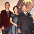 三谷幸喜監督の最新作『ギャラクシー街道』が10月24日(土)に公開初日を迎え、三谷監督ほか、主演の香取慎吾、綾瀬はるか、小栗旬、優香、西川貴教、遠藤憲一、段田安則、石丸幹二、大竹しのぶ、西田敏行が登壇した豪華舞台挨拶が全国126スクリーンに中継された。本作は、宇宙の片隅にあるハンバーガーショップを舞台に、そこで働く宇宙人夫婦と、彼らをとりまく“宇宙人”模様を描いたスペース・ロマンチックコメディ。宇宙人ノアを演じた香取さんは、映画の中に登場する、ちょっぴりエッチなあるシーンにちなみ、「直接触れることはできないんですが、皆さん、(人差し)指を出してください」と呼びかけると、自身も人差し指を観客に向け、「ああ…! 皆さんと一緒に、この『ギャラクシー街道』を感じることができました(笑)」とニヤリと笑い、場内を悲鳴と歓声の嵐に。さらに、「今後、街で会った時は、『握手してください』じゃなく、『指を合わせてもらえますか?』と言ってもらえれば」と煽り、女性ファンの心を鷲づかみにしていた。そんな香取さんだが、司会を務めたフジテレビの笠井信輔アナウンサーから「観終わった後に強烈に残るのは、遠藤さんの出産シーン! 主演として遠藤さんの怪演をどう思いましたか?」と水を向けられると、「羨ましいですよ。一生に一度あるかないか…いや、一度もないでしょう、出産シーンなんて!」と、綾瀬さん演じるノエの子供を身ごもり、バニーガール姿で出産するというシーンを演じた遠藤さんに嫉妬心をあらわに。「あんなに吹いちゃいそうになることってないんですけど、さすがにつらかった(笑)」「しかも、撮影の合間に僕と話す時も、(遠藤さんが)バニーガールの衣装の胸元を直しながら、『で、香取くんはあと何日ぐらいなの?』って!」と、遠藤さんに撮影中も休憩中も笑わされていた様子を暴露。それに対し、遠藤さんは「出産できると聞いて、即、飛び込みました。ただ、衣装合わせに行ったらいきなりあの格好(バニーガール)をさせられて」と回想。すると、三谷監督がすかさず「でも、あの衣装になったのは、遠藤さんから『足が自慢なので、足を見せたい。背中も見せたい』という話があったからなんですよ」と明かし、「俺、そんなこと一言も言ってないよ!」と否定する遠藤さんを尻目に、香取さんも三谷監督も「すごい綺麗だった!」と絶賛して笑いを巻き起こしていた。『ギャラクシー街道』は全国東宝系にて公開中。