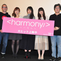 夭逝の作家・伊藤計劃の小説をアニメーション化した『ハーモニー』の公開を記念して11月14日(土)、メインキャラクター3人の声を担当した沢城みゆき、上田麗奈、洲崎綾とマイケル・アリアスとなかむらたかし両監督が舞台挨拶を行なった。伊藤計劃の原作を映画化していく「Project Itoh」の中の、『屍者の帝国』に続く第2弾で、伊藤氏の「フィリップ・K・ディック賞」を受賞した遺作を映画化。「大災禍」と呼ばれる世界的な混沌から復興し、その反動から極端な健康志向と社会の調和を重んじた、超高度医療社会を舞台に、そんな世界に抵抗を試みる3人の少女たちの姿を描く。複雑かつ、決して明るいとは言えない本作。ボイスキャストを務めた3人はどのように受け止めたのか? 沢城さんは「ひと言ではまとめられず、しばらくぼんやりして、でもあまりカチッと来る答えが出てこないで、見た人とたちと感想を言い合いつつ『そうかも…』と感じるような作品」と慎重に言葉を選びつつ語る。上田さんは「決してかけ離れてはいない、現代にもある物語と感じました。ひとりで抱えきれず、誰かと一緒に共感し合わないとわからない作品」と漏らす。洲崎さんも「見終わって、魂を持っていかれて戻ってこれなかったです」とその衝撃を口にする。それぞれ演じたキャラクターに関しても、霧慧トァンを演じた沢城さんは「履歴書があるようなキャラクターという印象がない! (人物像について)ひと言加えるというのが難しい」と声優陣が一様に感じているであろう思いを代弁!御冷ミァハ役の上田さんは沢城さんの言葉に深くうなずきつつ「難しくて、どういう人? とつかめず、監督から言葉をいただきながら、ようやく見つけた」と振り返るが、なかむら監督は、上田さんのミァハ役への起用について、最初に声を聞いて「少しイッてるな…、壊れてるなと感じたから」と独特の表現で説明し、会場は笑いに包まれる。3人の“対比”がキャスティングの上でも非常に重要になったというが、なかむら監督は、さらに零下堂キアン役の洲崎さんについても「普通だから」と説明。監督にとっては、その“普通さ”が、実はなかなかない貴重なものだったという意図だが、やや言葉足らずな説明に再び場内は爆笑に包まれる。沢城さんは「この場合、褒められてるから(笑)!」と何度も連呼して、上田さん、洲崎さんをフォローしていた。改めて本作について上田さんは「伊藤先生から問題を投げかけられた。一生かけても答えを見つけられないかもしれないけど、向き合っていきたいし、新しい角度で命を考えることができました」とその重みをしみじみと語る。洲崎さんは、本作が病にむしばまれた伊藤氏の遺作であることに触れ「病床の先生が、健康で病気がないことを“善”とする社会への疑問を投げかけた作品であり、生きてるって何? と価値観を揺さぶられる作品」と訴える。アリアス監督は「先生に映画館で見ていただきたかったです」とその早逝を惜しんだ。『ハーモニー』は公開中。