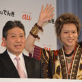 auの電気サービス開始にあたり、「auでんき発表会」が1月19日(火)都内で開催され、同社CMの「鬼ちゃん」でお馴染みの菅田将暉が登場した。弟と二人暮らしという菅田さんは、前日に初めて家のブレーカーが落ちたと言い、「2回ほど落ちまして。明日auでんきの発表会なのにと不安になりました…。そんなに使ってたのかなって気になりました」と電気料金プランの見直しを決意していた。「auでんき」は、auケータイ・スマートフォンの利用者向けに提供する電気サービス。ケータイ・スマホと合わせて利用することで、毎月の利用料金に応じて、最大5%相当分をキャッシュバックするというもの。本サービスは1月20日(水)10時より、auショップや「auでんき」HP等にて受付スタートとなる。これまで「鬼ちゃん」として5種類のCMに出演した菅田さんは「おいっす~」とCMの決め台詞(!?)と共に登場。実は4日前に「auでんき」の新しいCMを撮り終えたばかりだという。初めて「鬼ちゃん」が主役のCMになったということで、撮影を振り返って菅田さんは「珍しく男気というか筋力のいる場面があったんです。僕は筋力のなさでは定評があるので(笑)、頑張りました。すっごく楽しかったです」と満面の笑みを広げた。この日は、1月30日(土)より放送予定の新CMのメイキング映像が一足先に公開された。じゃれあいながら山道を歩く三太郎がたどり着いた先の広場には、今まで見たことがないような真面目な顔で、一心不乱に和太鼓を叩いている鬼ちゃんの姿があった。初めて映像を見たという菅田さん本人も、「格好よくてびっくりしました。現場も本当に映画のようなセットと照明だったので(仕上がりが)楽しみですね」と感想を話し、発表会でも和太鼓を力強く叩いた。さらに、2016年新たに始めてみたいことを尋ねられた菅田さんは「最近すごい趣味が増えたんですよ。洋服作ったり、音楽をやったり。そんな中で、英会話を始めたいなと思いまして、今年チャレンジします」と、意気込んでいた。