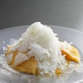 「ライムのソルベとマンゴーのクレープ」は、人気のクレープデセールをかき氷でアレンジ。マンゴーを贅沢に使用し、オリジナルクレープ生地の中にもマンゴーピューレを加え、上品な甘みのココナッツクリームを重ねた。そしてサーブされる時、目の前でさわやかなライムのソルベをかき氷のようにして振りかけて仕上げられる。この季節ならではの涼味あふれる一皿だ。