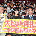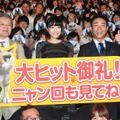 アニメーション映画『ルドルフとイッパイアッテナ』のヒット御礼舞台挨拶が8月16日(火)に開催され、ボイスキャストを務めた井上真央、八嶋智人に加え、原作を手掛けた斉藤洋が舞台挨拶に登壇した。シリーズ累計100万部を突破しているロングセラー児童文学を3DCGアニメーションで映画化した本作。ひょんなことから東京にやってきた好奇心日配の黒猫・ルドルフが野良猫のボス・イッパイアッテナや仲間たちと出会い、成長していくさまを描き出す。井上さんは開口一番「みなさん、こんばんニャ!」と挨拶。負けじと(?)八嶋さんも「元気ですかニャー!」と無理やりネコ語で挨拶し、会場を盛り上げる。八嶋さんが演じたおしゃべりなメス猫好きのブッチーが、映画を見た子どもたちから大人気だそうで、これには八嶋さんも大喜び! 「やったー! ブッチーよかったですか?」とノリノリで問いかけると、井上さんも「ブッチギリですね」とニッコリ。だが、2人以上にこの日、ノリノリだったのは原作者の斉藤先生。お気に入りのシーンを尋ねられると「ルドルフが冷凍車に入っていくシーン」とかなりマイナーなシーンを挙げ「あの自転車のおじさんが良い! あそこだけ何十回も見ました」と自転車のおじさんへの異様な思い入れを明かす。井上さんが「どなたが声をやられてるんですか…?」と尋ねると「私がやってます!」とニヤリ。実は先生、チョイ役での出演を映画化の際の条件としていたそうで、念願かなっての声優デビューに誇らしげに胸を張る。だが、そんな先生も井上さんの収録シーンを見て感動を覚えたそう。「音響監督がすごく厳しい方なんですが、井上さんはこんなに美しいのに謙虚なんです! 『すいません、勉強が足りなくて』とおっしゃるのを聞いて、ゾクッとしました」とその真剣かつ真摯な姿勢を称賛する。一方、八嶋さんが演じたブッチーについて「このシリーズの本当の主人公はルドルフではなくブッチーなんじゃないかと言う人もいるんですよ。(原作の)3巻、4巻あたりからブッチーが成長していくんです」と今回の映画では描き切れなかった先の物語に言及! 八嶋さんは先生の言葉に「これは続編、あるな! あるな、これ!」と大はしゃぎ! すると、先生も「(続編が作られたら)僕ももっと出たい!」と語り、八嶋さんと先生の間で続編に関する約束が成立…?だが先生は、続編になるにはもっと多くの人が本作を見る必要があると語り、大ヒット御礼舞台挨拶の場で「こんなもんじゃダメ! (人があふれて)消防署から文句が出るくらいじゃないと」と観客をあおる。この強い口調には思わず、八嶋さんも井上さんも「洋(苦笑)!」と先生をたしなめるが、井上さんは「続編は『ブッチーとヒロシの物語』で(笑)。私も何かの役で出られたら…」ともはや、ルドルフのことはそっちのけで続編談議に花を咲かせていた。『ルドルフとイッパイアッテナ』は公開中。