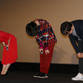 長編アニメ『君の名は。』のヒット御礼舞台挨拶が9月3日(土)、都内で行われ、新海誠監督、神木隆之介、上白石萌音、サプライズゲストとして主題歌と劇中の音楽を手がけた人気ロックバンド「RADWIMPS」(野田洋次郎、桑原彰、武田祐介)が登壇した。8月26日に全国301スクリーンで封切られ、公開8日間で動員212万7,800人、興収27億1,200万円の“特大ヒット”を記録中。神木さんは「本当に幸せなこと。感無量です」と満面の笑みを浮かべ、上白石さんも「幸せに満たされている」と夢見心地。ヒットを示す数字を耳にした新海監督は、「本当ですか? ピンとこないし、実感はゼロ」と恐縮しつつ、「ひたすらありがたい」と感謝を伝えた。音楽に話題が及ぶと「出来あがった映像に音楽をつけてもらったのではなく、一緒に作っていた感覚。音楽によって映像が変わったシーンもあるし、作品の背骨を作ってもらった気がする」と新海監督。そこに観客はもちろん、登壇者にもシークレットだった「RADWIMPS」が登場すると、会場は大歓声に包まれ「マジっすかあ!」(神木さん)、「本当に本物ですか?」(上白石さん)と大喜びだった。さらに野田さんがアコースティックギター1本で主題歌「前前前世」、上白石さんと一緒に劇中歌「なんでもないや」を生披露。その様子を客席で見守った神木さんは「今後見られないものを見てしまった」と感激し、ステージを終えた上白石さんは「18年生きてきて、一番の幸せ。一生の宝物です」と瞳をうるませた。また、新海監督も「完成までの2年間のごほうびを、皆さんと共有できて幸せです」と喜びを噛みしめていた。山深い田舎町に暮らす女子高校生の三葉と、東京で暮らす男子高校生の瀧が、夢の中で“入れ替わり”互いが生きる世界を通して、次第に惹かれあう。遠く離れた2人が夢の中で出会う意味とは? 時空を超えた少年少女の冒険が始まる。『君の名は。』は全国にて公開中。