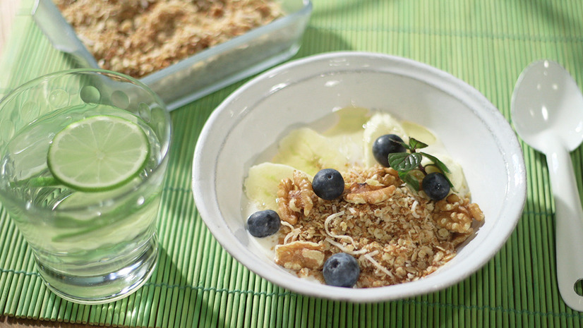 5.器にグラノーラ、バナナ、ブルーベリー、クルミ、ヨーグルト、ハチミツを入れて完成。