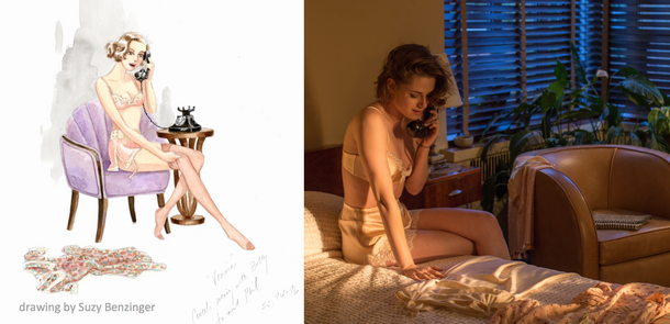 昨年のカンヌ国際映画祭を沸かせた、ウディ・アレン監督最新作『カフェ・ソサエティ』。この度、衣装のスージー・ベンジンガーのインタビューが到着し、スージーのイラストと下着姿も美しいクリステン・スチュワートの写真が公開された。もっと刺激的で、胸のときめく人生を送りたい。漠然とそんな願望を抱いたニューヨークの平凡な青年ボビーが、ハリウッドを訪れる。時は1930年代、この華やかなりし映画の都には全米から明日の成功を目指す人々が集まり、熱気に満ちていた。映画業界の大物エージェントとして財を築いた叔父フィルのもとで働き始めたボビーは、彼の秘書ヴォニーの美しさに心を奪われる。ひょんな幸運にも恵まれてヴォニーと親密になったボビーは、彼女との結婚を思い描くが、うかつにも彼はまったく気づいていなかった。ヴォニーには密かに交際中の別の男性がいることに…。本作は、アレン監督が『ミッドナイト・イン・パリ』のような陶酔と郷愁を再び紡ぐ、ビター&スウィートでゴージャスなロマンティック・コメディ。主演は以前にもアレン監督とタッグを組んだジェシー・アイゼンバーグ。共演にはブレイク・ライヴリーやクリステンなど豪華俳優陣が集結している。衣装を担当したスージーは、デザイナーのセオニ・V・アルドリッジと9年にわたって共に仕事をし、『ゴーストバスターズ』や『クラブ・パラダイス』『月の輝く夜に』『アイリスへの手紙』といった映画作品に携わった。アレン作品への参加は、『トラブル・ボックス/恋とスパイと大作戦』『地球は女で回ってる』『セレブリティ』『人生万歳!』『ブルージャスミン』『教授のおかしな妄想殺人』に続き本作で7度目。また、舞台の衣裳デザイナーとしても名をはせており、「ドリームガールズ」「ジプシー」「ミス・サイゴン」「サタデー・ナイト・フィーバー」「コーラスライン」などにも参加している。そんな数多くの作品で一緒に仕事をしてきたアレン監督についてスージーは、「素晴らしい人よ。彼は脚本を書くのがとっても早くて私が知る誰よりも働き者ね。一日中働き、脚本を書くか編集作業をするか、そうでないときはクラリネットを吹いている」と絶賛し、また「みんなウディの早いスピードについていくので精一杯! スケジュールを見たキャストが『1日5シーンもやるなんて無茶よ!』とよく言うけど、ウディは大丈夫なの。彼の頭は一時も休まないし長年の経験で撮るものが明確になっているの。でも女優たちには同情するわ。ブレイク・ライヴリーは台本を手に持ってトレーラーやヘアメイク室まで走って移動していたのよ!」と明かす。そして、本作のお気に入りのシーンについて、クリステンとジェシーの海辺のシーンを挙げたスージーは、「ウディもスタッフも砂の上にいて、みんな波を被ってびしょ濡れ。ジェシーに着せていた本物の1930年代のパンツも濡れてしまって、スタッフは大笑いよ!」と撮影をふり返り、「この映画で一番の喜びは、クリステンとジェシーと一緒に仕事ができたこと。ウディはわかってないけど、ほとんどの俳優にとってウディとの仕事はとても緊張するもの。でも、2人はお互い仲が良くて、周りを楽しませる、本物のプロだった。一番初めにセットに現れて、最後にセットを出るような人なのよ。どんな監督でも2人と仕事をするのは最高だと思うわ!」とクリステンとジェシーについて語っている。『カフェ・ソサエティ』は5月5日(金・祝)よりTOHOシネマズみゆき座ほか全国にて公開。