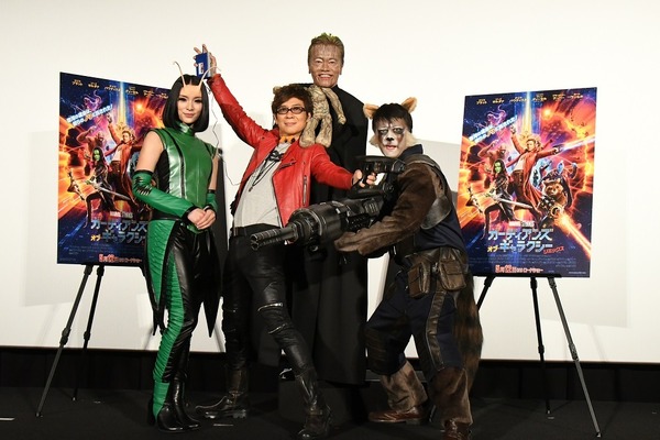 5月5日より日本に先駆け全米で公開、前作を大きく上回る成績でNo.1スタートを切り、12日(金)の日本公開も期待がかかる『ガーディアンズ・オブ・ギャラクシー:リミックス』。この度、本作の3D吹き替え版お披露目試写会が本日8日(月)に行われ、本作の日本語吹き替えを担当した山寺宏一、加藤浩次、遠藤憲一、秋元才加が登壇し会場を沸かせた。本作は、銀河を舞台にスター・ロード(クリス・プラット)率いる負け組ヒーローチーム“ガーディアンズ・オブ・ギャラクシー”が、ノリと笑いで銀河を守る(?)最強に笑えるアクション・アドベンチャー作品。今回、上映前に行われた舞台挨拶では、吹き替えキャスト全員が本格的な特殊メイクに挑み、それぞれ役になりきって登壇! 主人公で永遠の思春期リーダー、ピーター・クイル役を演じる山寺さんは、愛用のカセット&ヘッドホンで装いもキャラクターに寄せてノリノリ。凶暴な毒舌アライグマのロケット役の加藤さんは、毒舌トークはそのままに、愛らしい(?)アライグマに変身! 触角が生えた独特のビジュアルと純粋すぎて不思議ちゃんな新キャラ・マンティス役を演じた秋元さんは、触角をつけて特製衣装で。そして、超絶カワイイ最終兵“木”ベビー・グルート役を演じた遠藤さんは、“木”の特殊メイクを施し、キャラクター同様衝撃の25cmサイズで登場した。“なりきリメイク”についてキャスト陣は、「僕、もみあげだから3分でした(笑)。クリス・プラットのようにイケメンに特殊メイクしてくれと言ったら、逆に無理だと言われました(笑)」(山寺さん)、「結構時間かけてやったのに、思いのほか反応薄かったよな(笑)みんな1時間くらいかかったよね!」(加藤さん)、「俺、自分の職業が分からなくなってます(笑)」(遠藤さん)、「映画を観たときから『似てるんじゃない?』と言われていたので、今日を楽しみにしていました! 黒のコンタクトレンズをしているので、虫の感じが増していますよね。なりきれてよかったです!」(秋元さん)とそれぞれ感想を語る。また、自身が高校生や大学生のときに聴いていた楽曲が劇中で使用されていると話す山寺さんは、「青春の音楽がたくさん! でも、若い世代にとってもこんなヒット曲があったのかと新鮮に聴けると思います。そんな楽しみ方もできる作品です」と話し、加藤さんも「グルートが小さくなったじゃないですか。だから、ベビー・グルートとロケットのやり取りを見て欲しいです。なかなか伝わらないやり取りが物語を面白くしてます!」と見どころをコメントしていた。さらに、加藤さんからはサプライズ発表として、「ガーディアンズチームが、アベンジャーズに参戦するんです! だから、不祥事には気を付けないとね(笑)」と周囲の笑いを誘い、アベンジャーズ参戦に向けて気合いを込めた。『ガーディアンズ・オブ・ギャラクシー:リミックス』は5月12日(金)より全国にて公開。