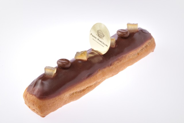 ピエール マルコリーニ_エクレア「カプチーノ」芳ばしいコーヒーの香りが効いたカスタードクリームにミルクチョコレートのグラサージュ、レモンコンフィの酸味がアクセントになったエクレア「カプチーノ」。