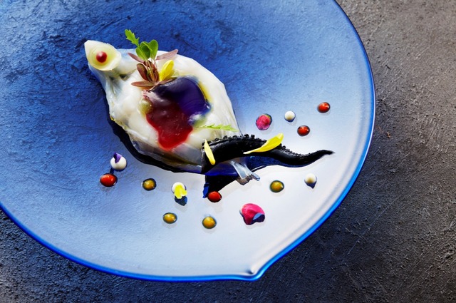 料理長の大久保シェフは、19歳で調理の世界に入り、フランスのミシュラン星付レストランで研鑽を積み、帰国後は「ベージュ アラン・デュカス東京」や「ピエール・ガニェール・ア・東京」で腕を振るった実力者。秋の新コースメニューでは、そんな大久保シェフならではの、色彩感覚と大胆な食材のマリアージュによる重層的な味わいの妙を堪能できる。