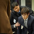 到着した場面写真では、眼鏡にスーツと地味な姿を披露し、これまでのイメージを一気に覆すような表情を見せるイ・ビョンホンの姿を捉えた。まず1枚目は、倒産した証券会社の支店長カン・ジェフン(イ・ビョンホン)が、顧客に対して床に手をつき謝罪する姿。そして、離れて暮らす幼い息子からのメッセージカードを読み、感慨にふける父性愛を感じる姿。