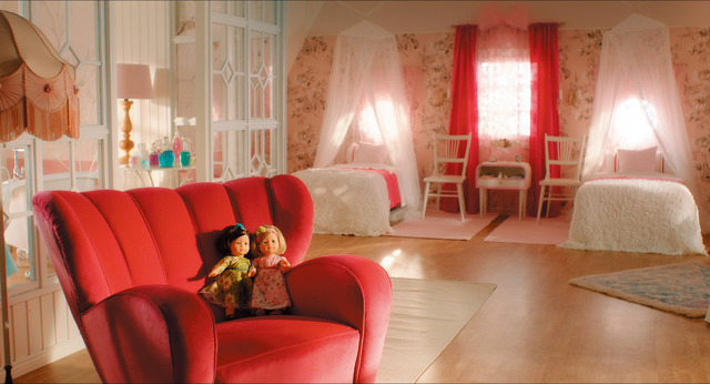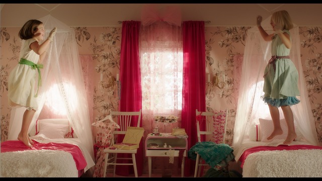 素敵な白い階段を駆け上がった2人が見つけたのは、キラキラ光るクリスタルでできたカーテンがかかる、かわいらしい壁紙のお部屋。赤いソファの上にはオンネリとアンネリそっくりの人形が飾られ、テーブルにはドールハウス。そして、クローゼットには2人のサイズにぴったり合わせたお揃いの洋服がぎっしり入っているのを見つけた2人は、レースの手袋に手を通し、おいしいチョコレートをつまむ。それから、レースの天蓋付きのベッドで飛び跳ねる…。
