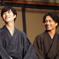 岡田さんは、「4月から稽古を始めて、菊比古とともに落語を歩んでいる感じです。暑い中、着物で大変ですけど、いいドラマを作ろうと思ってやっています」と気合いをみなぎらせる。そんな岡田さんに劇中、憧れと嫉妬の眼差しを向けられる役の山崎さんは、「ミュージカルだとプリンスと言われることもあるんですけど、あ、自分でも言いました(笑)」と自画自賛ながらの自己紹介で場をあたためると、岡田さんらも爆笑。続けて、山崎さんは「自分とは正反対な、がさつで女好きで破天荒な役。僕にとって新たなチャレンジなので、全身全霊で挑みます」と、風貌も普段のプリンス山崎さんとは異なる褐色の肌をさらしていた。