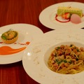 続いては東京ディズニーシーにあるカフェ・ポルトフィーノの「スペシャルセット」(1,880円)。海老のフリットと一緒にいただくリングイネは、紫水菜と食花があしらわれた華やかなひと品。チャウダーにはビーツのピューレがかけられていて、混ぜるとピンク色に変化する演出がニクい。クリスマスツリーのチョコレートを飾ったムースケーキは、ピスタチオとラズベリーのソースと一緒に。見た目も味もバツグンだ。