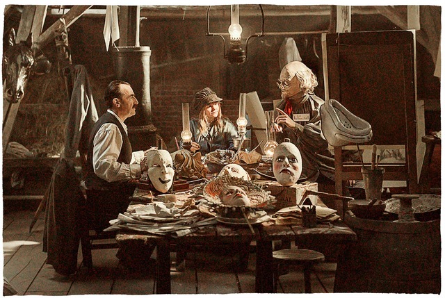 また同時に公開された場面写真では、鼻から下を包帯で覆うエドゥアールを優しく抱くアルベールの姿や、不気味な仮面いくつも置かれたテーブルを囲んで何やら作業をする登場人物たちの姿が写し出されている。