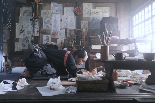 今回初解禁となった本作の場面写真にも、若かりし頃から晩年まで変わることなく、飽くなき向上心のままに一心不乱に作品づくりに没頭する青年期と老年期の北斎や、若き北斎と対峙し、のちにその才能を見出す蔦屋、妖艶なまなざしで花魁を描こうとする美人画の大家・歌麿、種彦の書いた書物に目を落とし、言葉を交わしている様子の老年期・北斎の姿などが収められている。